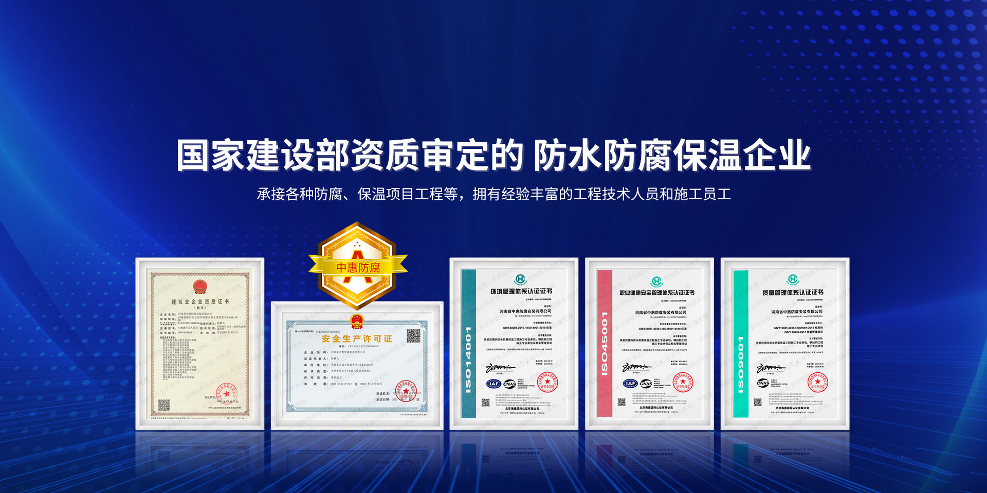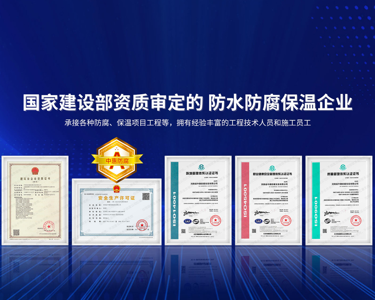 公司經營范圍:防水防腐保溫工程;消防設施工程;建筑裝修裝飾工程;建筑機電安裝工程;電力工程;建筑工程;石油化工工程;工業清洗工程;油罐清洗工程;鋼結構工程;環保工程;模板腳手架工程;電纜防火封堵、防污閃噴涂、外墻外保溫工程;各類施工勞務作業;設備維修、船舶鉚焊、涂裝;電力工程材料、建材、防水材料、防火材料、防腐保溫材料銷售,并相繼通過了GB/T19001-2008idtISO9001:2008GB/T50430-2007質量管理體系認證證書。GB/T24001-2004idtISO14001:2004環境管理體系認證證書。GB/T28001-2011idtOHSAS18001:2007職業健康安全管理體系認證證書。公司是中國防腐蝕于防護協會、中國施工企業管理協會、電力協會和中國鋼結構防水協會會員單位。 公司的經營業務涵蓋了石油、化工、電力、冶金、煤炭、船舶、國防、燃氣、水利、環保、交通運輸、航空及國防軍工和輕紡市政等行業的防腐保溫絕熱設備。鋼結構安裝、防火、防水、金屬噴鍍、聚脲噴繪、陰極保護、防滲透堵漏、玻璃鋼及各種磚版材料襯里、橡膠襯里、煙氣硫和耐酸溶劑腐蝕等工程施工。公司連續十年榮獲“省市先進施工企業”“安全生產先進單位”“重合同,守信用企業”和“AA***資質企業”的稱號。2000年被命名為市級文明單位,2002年被國家工商行政管理局命名為“重合同,守信用的企業”、被中國工業防腐蝕技術協會命名為“防腐蝕企業,能源節約及環境保護領域有豐富的經驗和***的業績。工程一次交驗合格率100%。其中攀枝花鋼鐵公司煉鐵廠四號高爐及熱風爐防腐工程、上海寶鋼公司煤氣柜防腐工程、撫順石油一廠裝置防腐項目、齊魯石化公司稀烴廠高塔防腐工程、吉林化學工業公司煉油廠油罐防腐工程、天津石化熱電廠六號爐頂棚聯絡管保溫工程、大慶油田(太倉)力神泵業工程、中國化學工程第十一建設工程、中原油田勘探局工程、中國石化銷售有限公司華北分部、魯皖輸油管道工程、貴州開磷息烽合成氨工程、陜西黃陵煤化工程、中國石油天然氣西部管道塔里木輸油工程、邯鋼集團邯寶鋼鐵公司煉鐵工程、德州供電工程、吉寶(南通)船廠工程,偃師華潤熱力工程、鄭州熱力總公司。 河南省中惠防腐安裝有限公司愿以豐富的施工經驗,***的技術,***的設備,***的管理,***的服務,竭誠為國內外廣大的用戶提供***滿意、******的工程作品。 我公司愿與國內外同仁一道,團結協作,共同推進防腐蝕行業發展! 公司地址:河南省長垣縣建設路北段360號 固定電話:0373-8866488 郵編:453400 網址:http://www_zhff_com_cn.abtno1.com